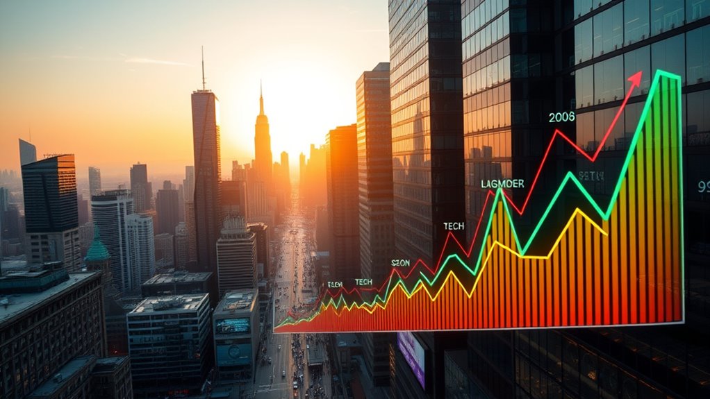 In 2026, you’ll want to focus on sectors that adapt quickly to changing conditions, such as technology and healthcare, which show resilience and growth potential driven by innovation and demographic trends. Cyclical sectors like industrials and consumer discretionary could also offer opportunities as the economy grows. However, stay alert to volatility and shifts caused by inflation, interest rates, and geopolitics, which can quickly change sector prospects. Keep exploring to uncover how to position yourself for these evolving trends.