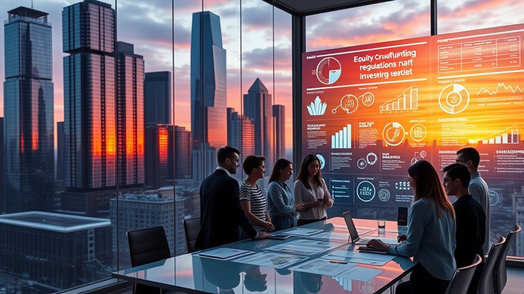 Equity crowdfunding in the US allows you to invest directly in startups and small businesses through regulated online platforms, opening new opportunities for diversification. The SEC guarantees investor protections by requiring companies to disclose financial details and adhering to investment limits based on income and net worth. These regulations help you participate safely while supporting innovative ideas. If you want to understand how these rules create valuable opportunities and safeguard investors, there’s more to explore.