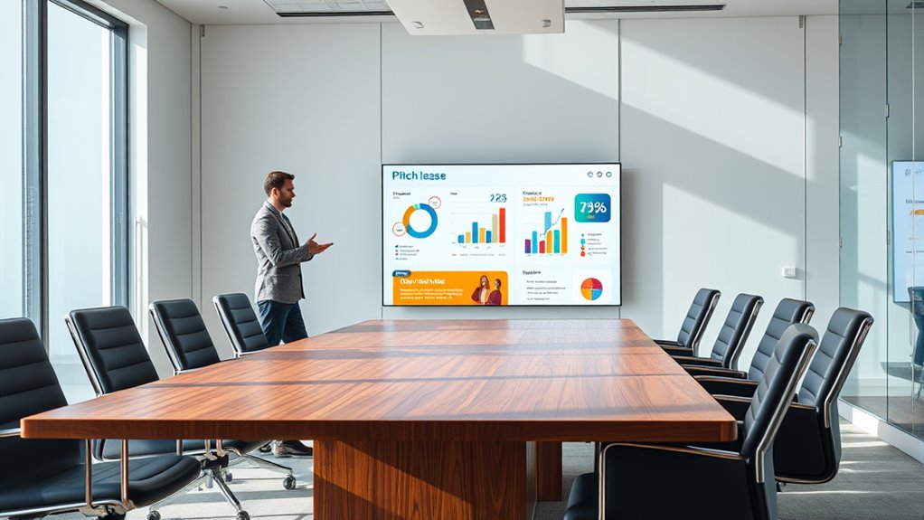 To attract investors with your pitch deck, focus on presenting a thorough market analysis that highlights your target market size, growth potential, and key trends. Clearly identify your competitors, comparing strengths and weaknesses while showcasing your unique value proposition. Use visuals like charts and SWOT analyses to make complex data easy to grasp. Demonstrating your understanding of the market and competitive landscape boosts credibility and investor confidence—continue to explore how to craft a compelling pitch that positions your business for success.