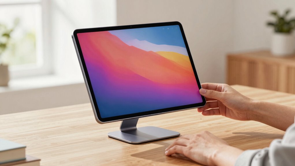Don’t put all your eggs in one basket when choosing a portable monitor for dual-screen setups. Focus on ergonomic adjustments like adjustable stands and tilt angles to stay comfortable. Consider power consumption to guarantee your devices last longer on the go. Match screen sizes for a seamless experience, and check compatibility with your laptop or tablet. Balance size, portability, and features to create a setup that works best for your needs.