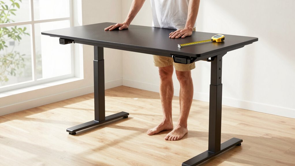 Arm length greatly impacts your desk height choice, as longer arms may require a higher desk to maintain wrist comfort and proper posture alignment. Shorter arms might need a lower setting to prevent strain. When adjusting your desk, make sure your elbows stay close to your sides and form about a 90-degree angle, promoting ergonomic wrist comfort and posture, reducing fatigue, and preventing discomfort during extended standing or working sessions.